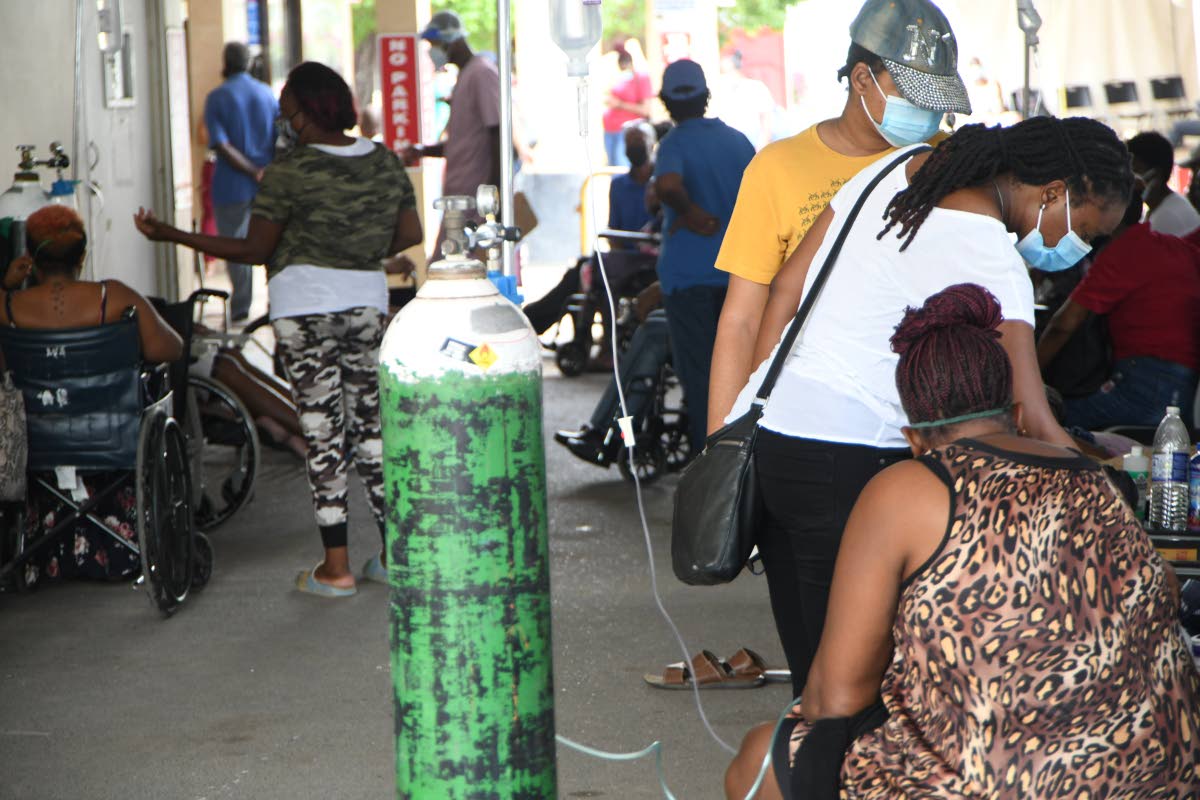 Patients on oxygen sitting in the driveway of the undercarriage at the Univerity Hospital of the West Indies waiting for assistance on Monday.