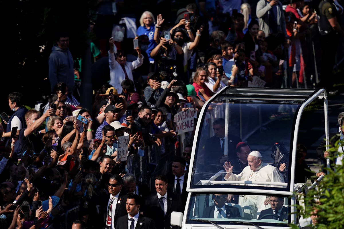 Pope Francis arrives for mass at the National Shrine of Saint Anne de Beaupre on Thursday, in Saint Anne de Beaupre, Quebec. Pope Francis is on a “penitential” six-day visit to Canada to beg forgiveness from survivors of the country’s residential schools, where Catholic missionaries contributed to the “cultural genocide” of generations of Indigenous children by trying to stamp out their languages, cultures and traditions.