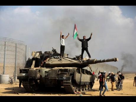 Palestinians wave their national flag and celebrate by a destroyed Israeli tank at the Gaza Strip fence east of Khan Younis southern Saturday, Oct. 7, 2023. The militant Hamas rulers of the Gaza Strip carried out an unprecedented, multi-front attack on Israel at daybreak Saturday, firing thousands of rockets as dozens of Hamas fighters infiltrated the heavily fortified border in several locations by air, land, and sea and catching the country off-guard on a major holiday. (AP Photo/Yousef Masoud)