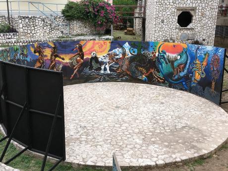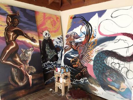 His final and most memorable piece is Origin - his Edna Manley final-year independent study and exhibition piece of this year. He describes this body of work as a culmination of years of artistic practice and input from all his lecturers at the tertiary, secondary and elementary levels. The 64' x 8' mural contains a number of illustrations falling under the theme of religious and scientific cosmology.