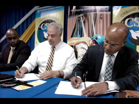 From left: Labour planning and deployment manager at the Shipping Association of Jamaica (SAJ) Terrence Brooks looks on as Kim Clarke, SAJ president and National Security Minister Peter Bunting sign a Memorandum of Understanding for a stevedore-training partnership programme.