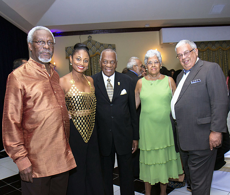 From left: Former Prime Minister Percival James Patterson, Odette and Godfrey Dyer, Denise and Winston Dear are in a light mood at the Daswanis’ 50th-anniversary party at the Half Moon last Saturday night.
