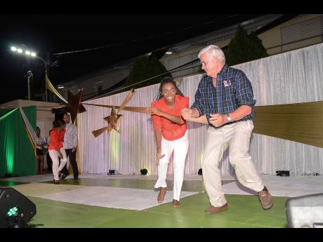 A member of the Ashe dance group (left) and a member of the audience, Bernie Spitzley, show off their best dance moves on stage at Shortwood Evening of Exellence, held recently at the Shortwood Teachers’ College.