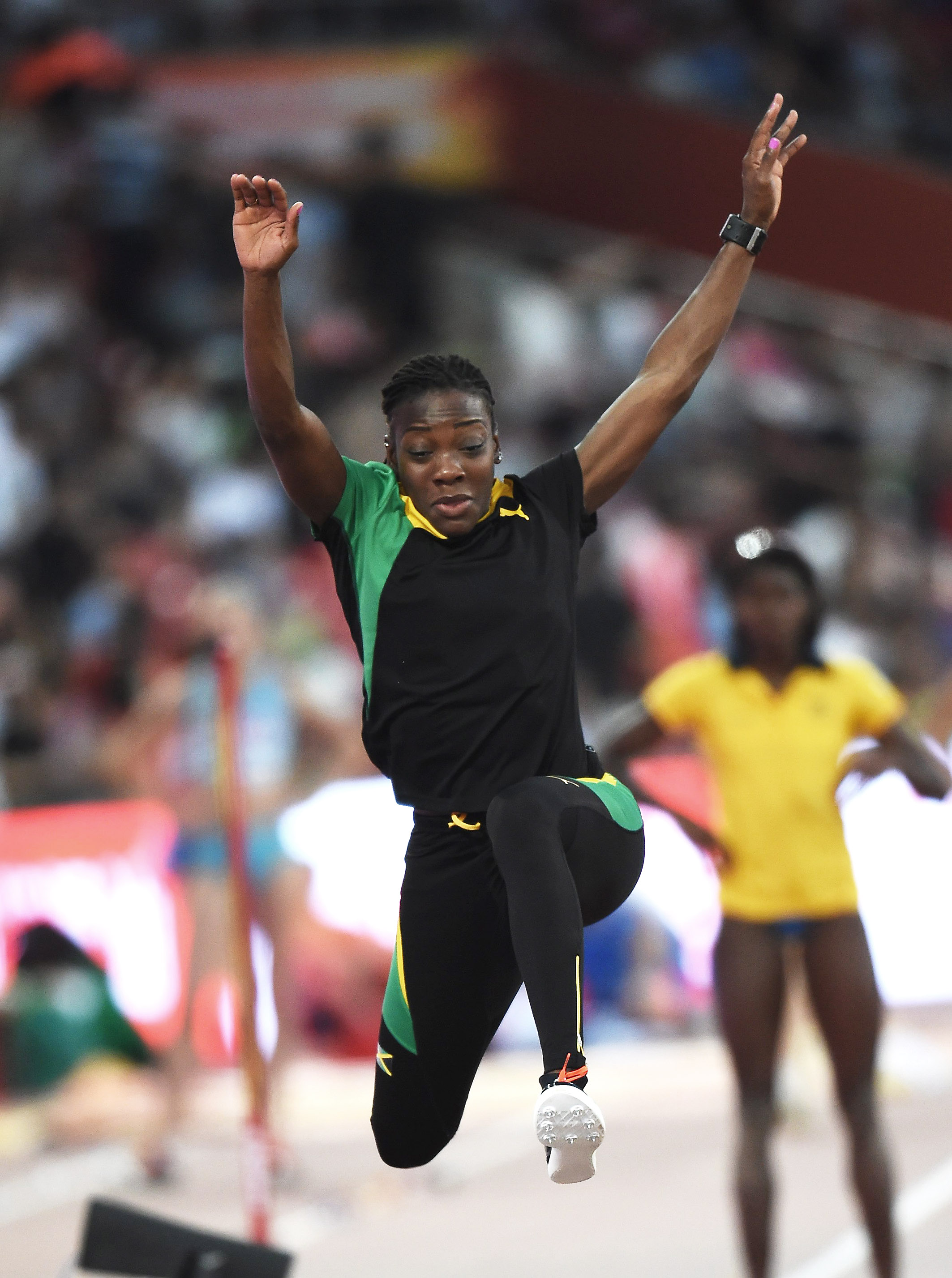 Usain Bolt (back to camera) watches the Bird's Nest stand at attention as the Jamaica flag flies in the background, during the playing of the Jamaica National Anthem at the medal presentation ceremony for the men's 100-metre final at the IAAF World Championships yesterday.