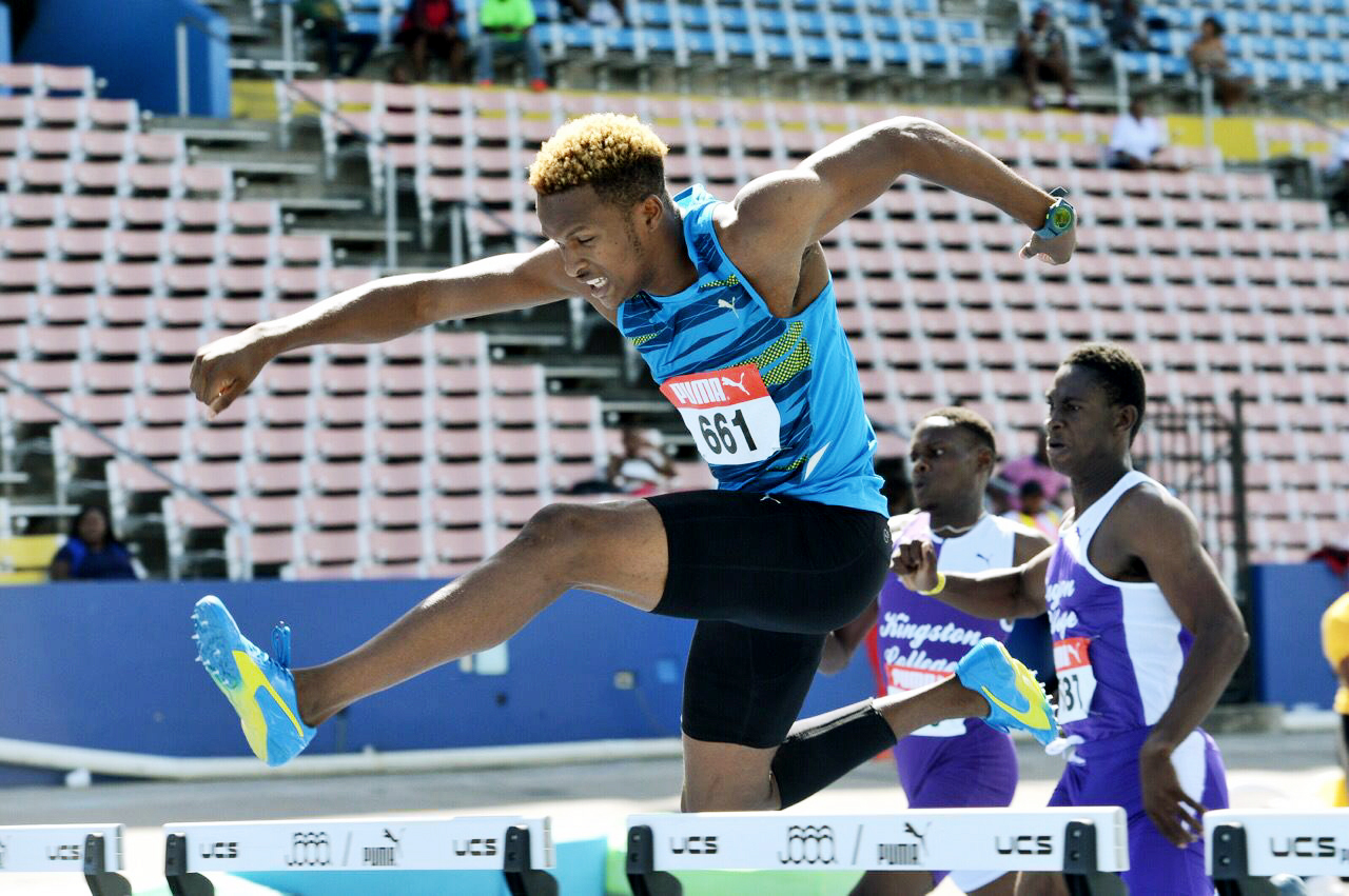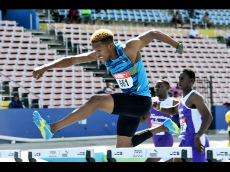 Jaheel Hyde powering to victory in the Under 20 boys 400m hurdles final at the JAAA National Junior Championships yesterday. Hyde clocked 51.47 seconds.