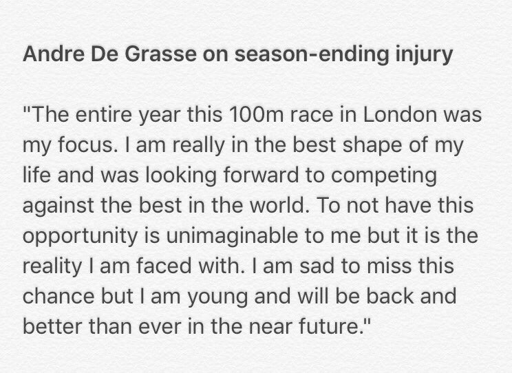 De Grasse, who won bronze in the 100m at the last World Championships in Beijing in 2015 was expected to challenge Jamaican Usain Bolt for the 100m gold medal on Saturday night here.