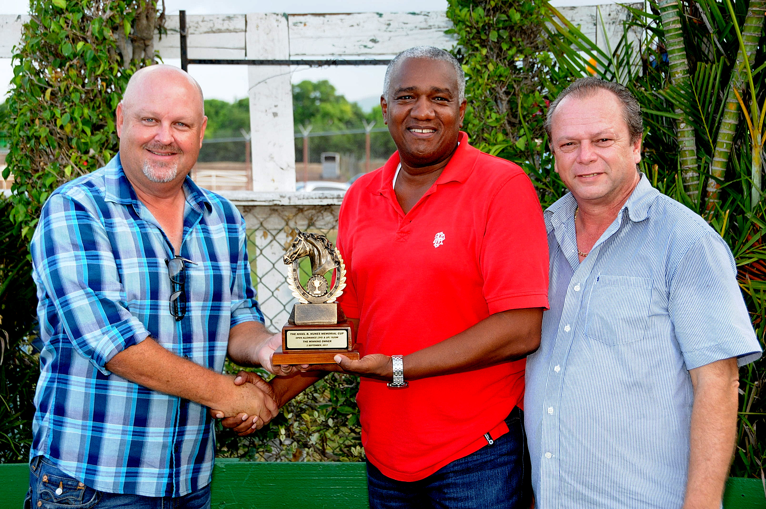 Anthony Nunes (left) presenting the Nigel B. Nunes Memorial Cup, named after his late father, to owner Michael Bernard after BRAWN won the feature event over 1820 metres at Caymanas Park last Saturday. Looking on at right is winning trainer Gary Subratie.