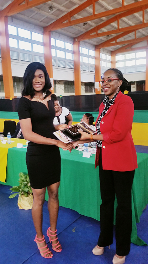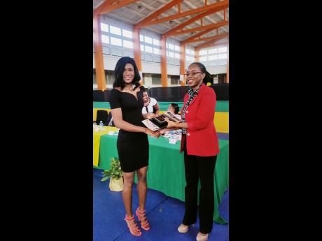 World Championships bronze medallist Ristananna Tracey receiving her award from Suzzette Ison, director of sports policy development in the Ministry of Culture, Gender, Entertainment and Sport, at G.C. Foster College yesterday.