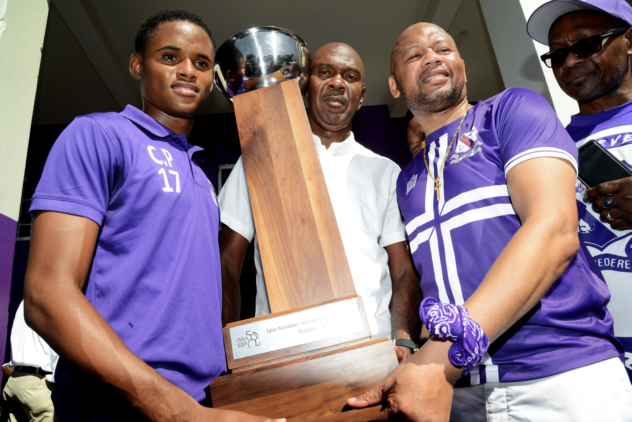 Peter Wanliss (left) holds a framed photo of past Clarendon College coach Winston Chung-Fah. At right, coach Lenworth 'Lenny' Hyde is congratulated by Clarendon College supporters following their 1-0 win over Kingston College in the Olivier Shield at the National Stadium on December 8, 2018.