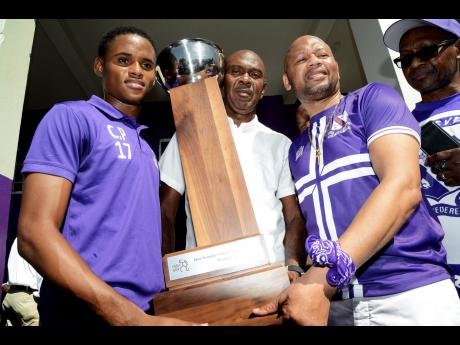 From left: Kingston College's team captain Casseam Priestly, head coach Ludlow Bernard and former KC standout Douglas 'Dougie' Bell, lift the ISSA-Digicel Manning Cup trophy, during a celebration ceremony at Kingston College's North Street campus on December 3.