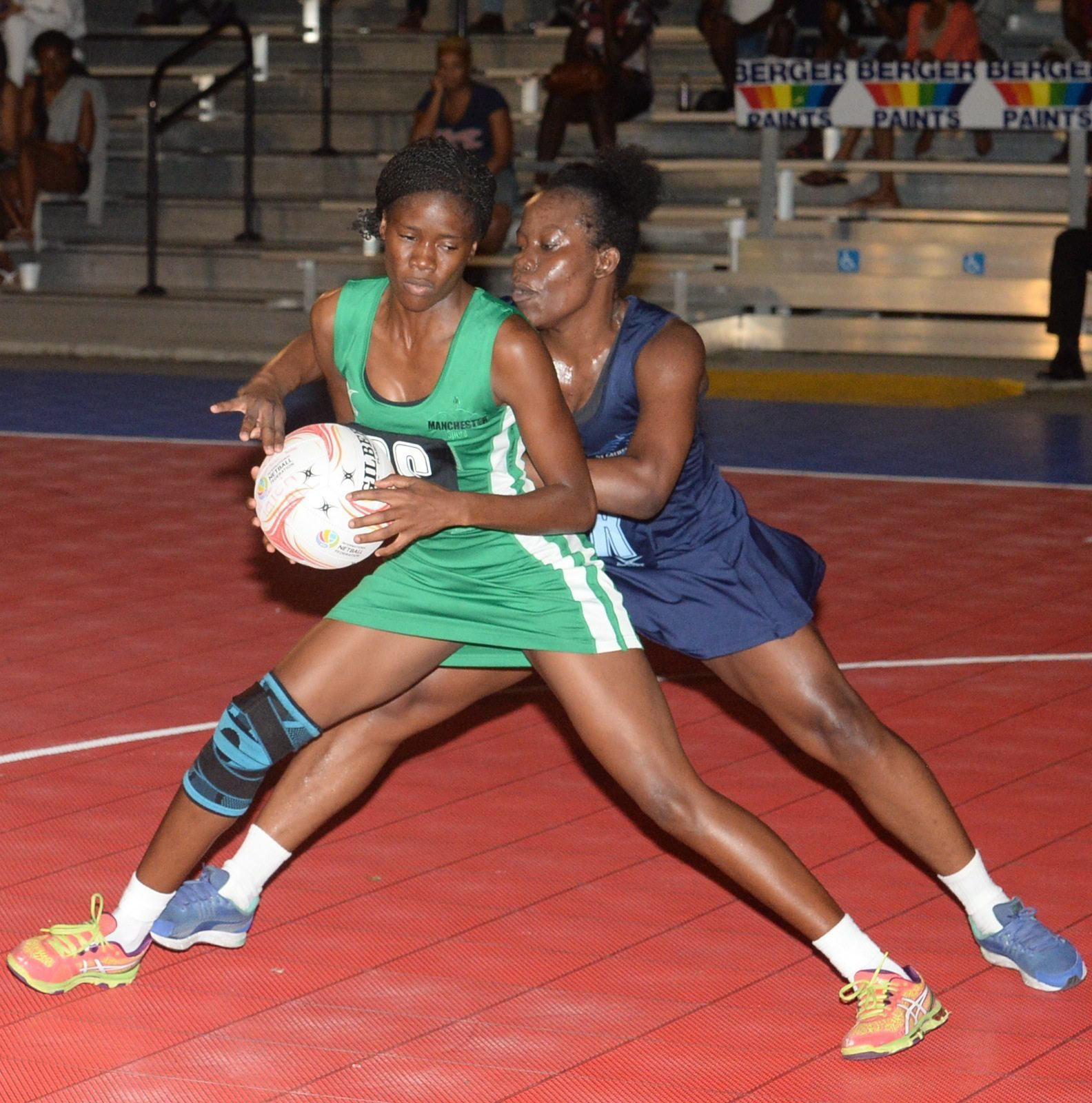 Nicole Dixon (GS) of Manchester Spurs holds ball of Antoinette Stone of St Catherine Racers during a Berger Elite League netball match at the Leila Robinson Courts last season.