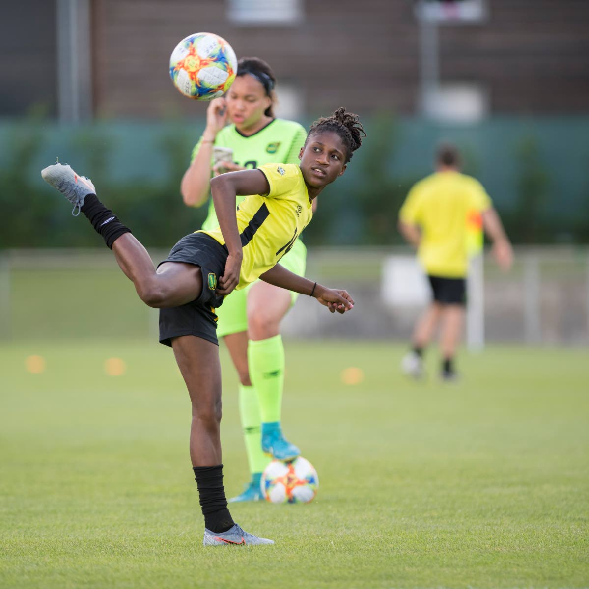 Defender Deneisha Blackwood (front) displays her control of the ball while goalkeeper Yazmeen Jamieson looks on in the background during a Jamaica senior women’s football team training session at Stade Eugene Thenard in Grenoble, France, yesterday ahead of their FIFA Women’s World Cup Group C match against Australia.