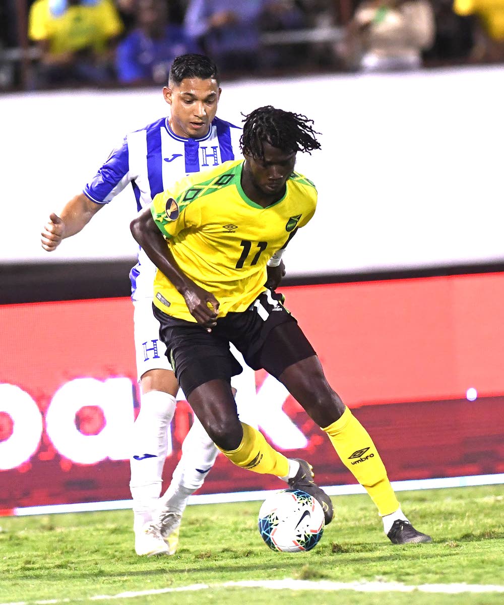 Jamaica’s Shamar Nicholson (front) dribbles away from Honduras’ Emilio Izaguirre in their Concacaf Gold Cup match held at the National Stadium in Kingston on Monday, June 18, 2019. This was the first-ever staging of a Concacaf Gold Cup double-header by a Caribbean country.