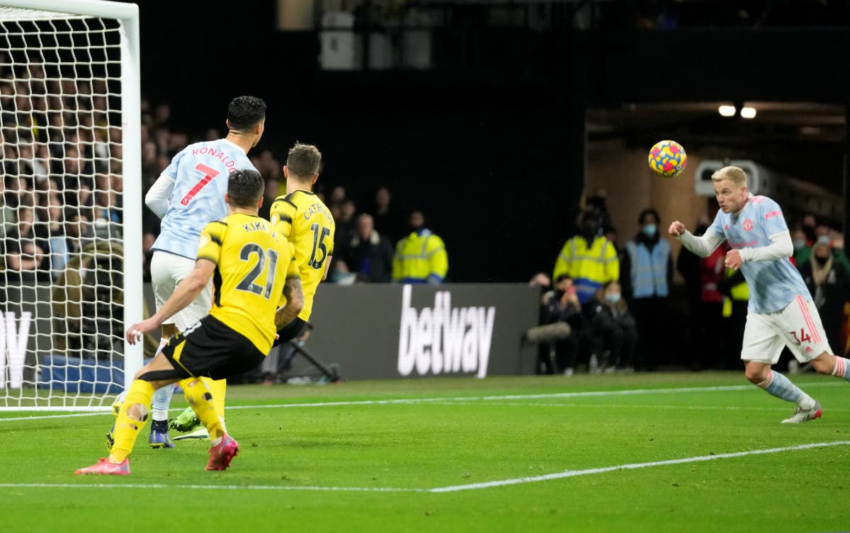 Manchester United’s Donny van der Beek (right) scores his side’s goal during their 4-1 loss in the English Premier League to Watford at Vicarage Road, Watford, England, on Saturday.