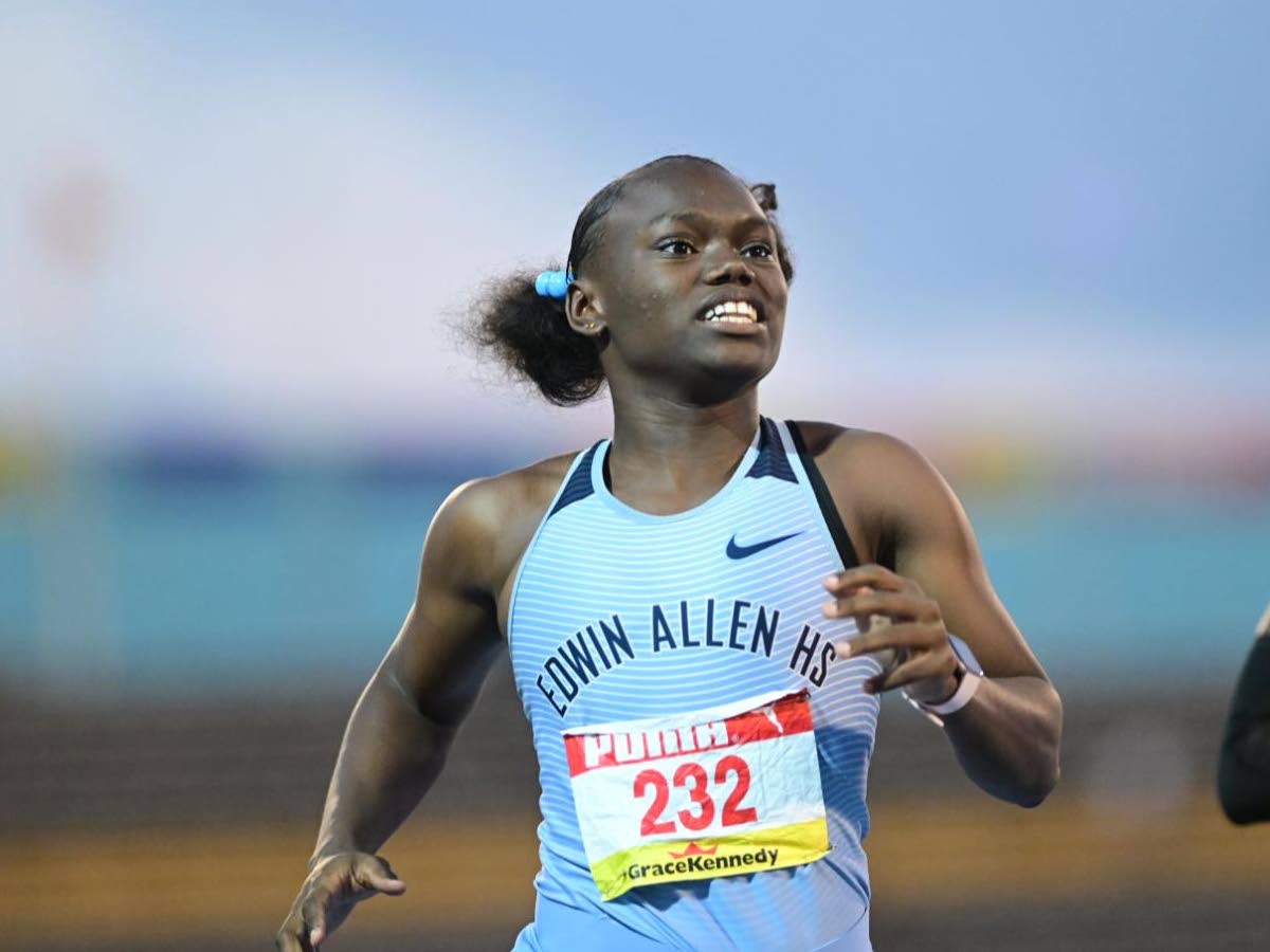 Edwin Allen’s Serena Cole eases after winning her semifinal heat at the ISSA/GraceKennedy Boys and Girls’ Championships at the National Stadium today.
