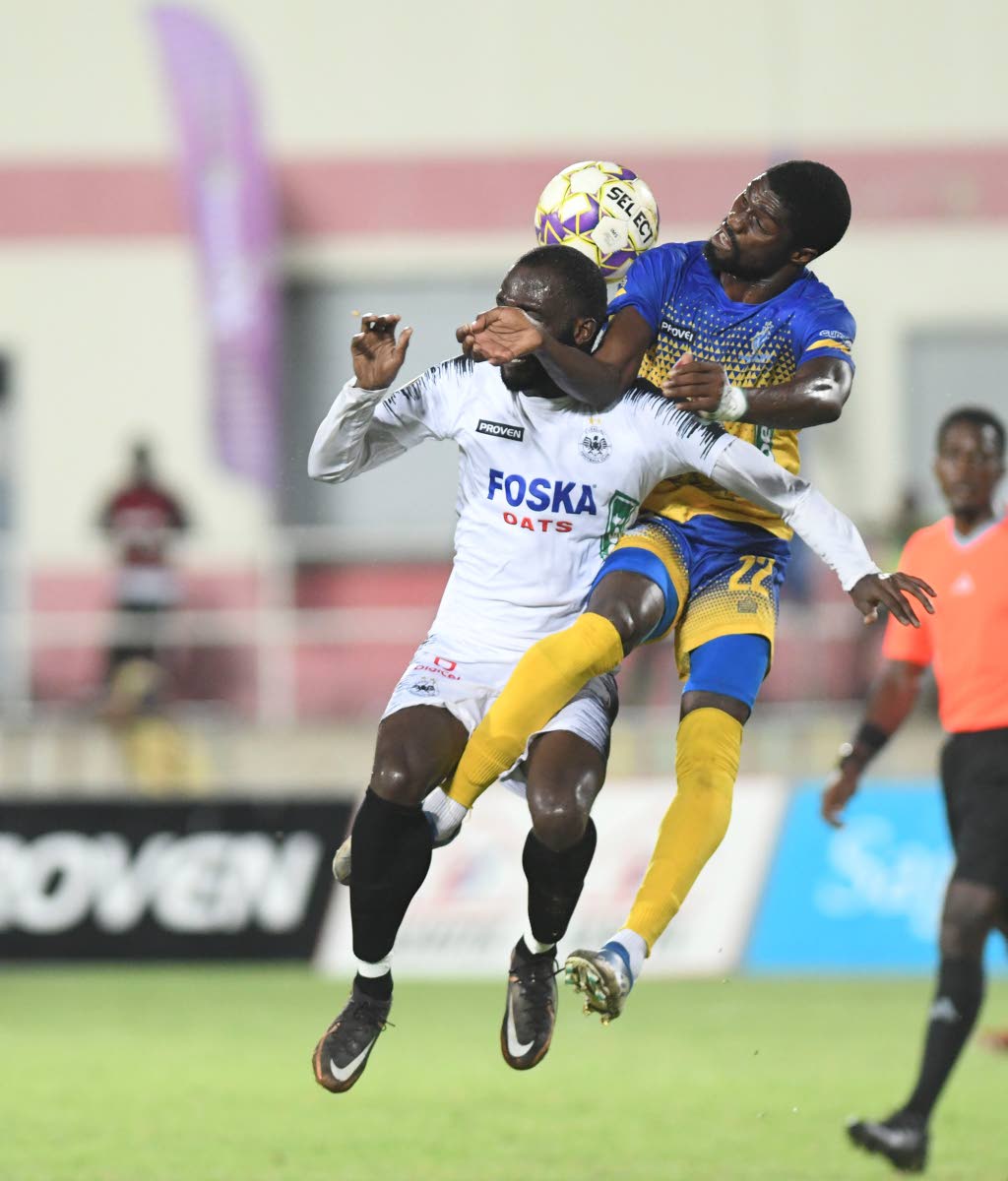 Harbour View’s Colorado Murray (right) gets a hand in the face of Cavalier’s Nickache Murray as they jump for the ball during their Jamaica Premier League (JPL) second-leg semi-final match at Sabina Park recently.