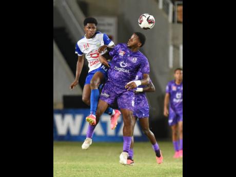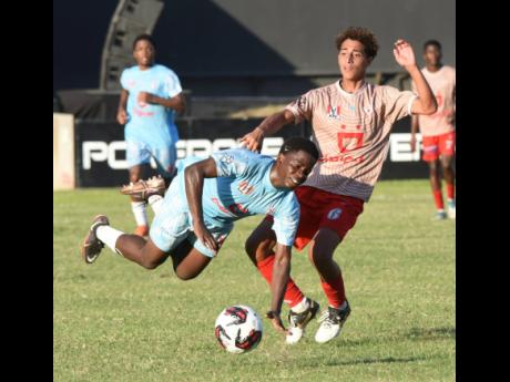 Keyanni Jackson (left) of Hydel High and Kingston College’s Dujaun Green battle for the ball during their Manning Cup semi-final match at Sabina Park yesterday.