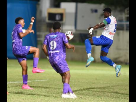 Ronaldo Barrett (right) of Hydel High clears the ball away from Kingston College’s Robert Seow (left) and Damario Dailey (centre) during their Manning Cup semi-final match at Sabina Park yesterday.