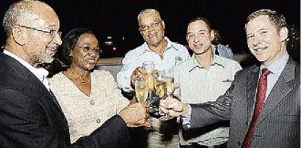 With champagne flutes raised, GraceKennedy Limited and Scotiabank Jamaica toasted the $1.875-billion loan deal at the Spanish Court Hotel in New Kingston on Monday. Seen (from left) are GraceKennedy executives, Douglas Orane, chairman and chief executive officer; Fay McIntosh, chief financial officer; Erwin Burton, group deputy CEO and CEO of GK Foods, and Don Wehby, group chief operating officer; and from Scotia Group Jamaica, President and CEO Bruce Bowen. - Contributed