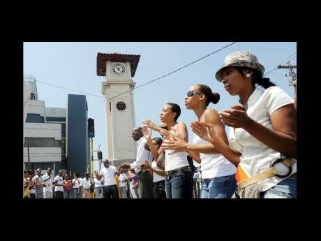 Singers, deejays and others flocked the clock tower in Half-Way Tree, St Andrew, for a vigil around 9 a.m. yesterday after hearing news that Oneil Edwards, a member of dancehall trio Voicemail, had been shot earlier in the morning.