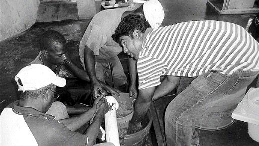 Water is pumped from the sea into a 50-acre reservoir, from which it is gravity-fed or pumped into two-acre and five-acre ponds stocked with very young shrimp, called 'post-larvae', imported from Miami or Cuba.