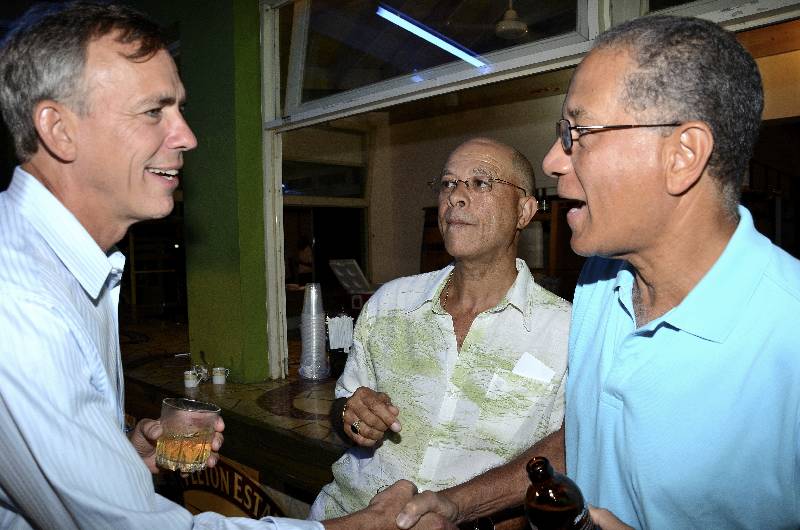Mark Scott (left) greets Stephen Hill (right), while Donald Patterson looks on.