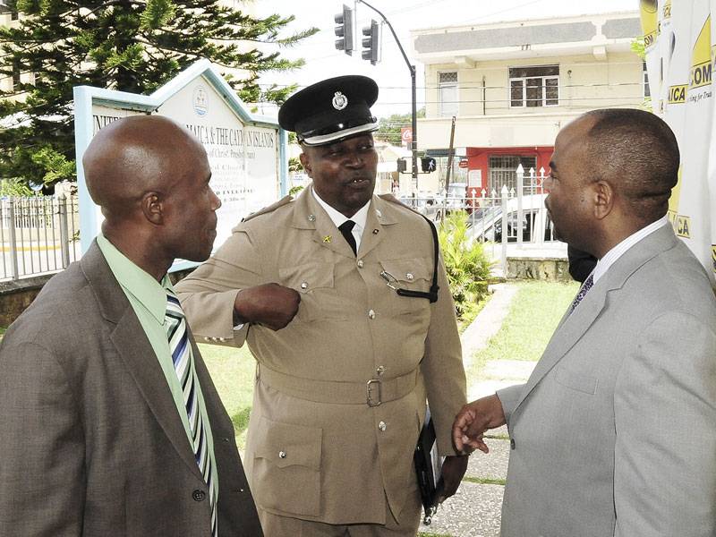 Assistant Commisioner of Police in charge of Area One, Devon Watkiss (centre), shares a word with head of the Independent Commission of Investigations (INDECOM), Terrence Williams (right), and head of the St James police, Superintendent Egbert Parkins. The occasion was INDECOM's second anniversary church service on Sunday at the St Paul's United Church in Montego Bay, St James. - Photo by Barrington Flemming