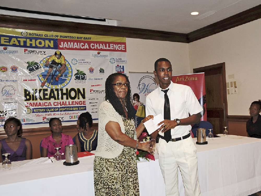 President of the Rotary Club of Montego Bay East, Lilieth Gregg, presents a scholarship award to Jason Bowen, second-year medical student of the University of the West Indies, at the club's bike-a-thon project scholarship award ceremony at the Sunset Beach Resort Spa and Water Park last Wednesday. - Photo by Barrington Flemming