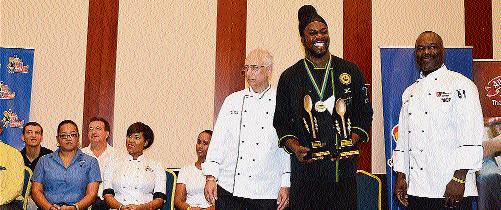 From left: Chief Judge at Taste of Jamaica, Chef Donald Allesandro, from Art Institute of Fort Lauderdale; Nicholas Douglas, Pastry Chef of the Year and Best Showpiece Creation at Taste of Jamaica; Chef Joseph Marshall, Art Institute of Fort Lauderdale, at the 2013 staging of the Best Dressed Chicken, Taste of Jamaica culinary competition held in Montego Bay recently. - Photo by Karrie Williams