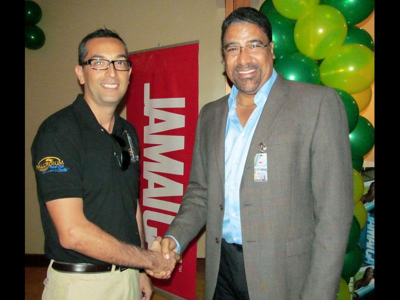 General Manager of the Grand Palladium José Morgan (left) greets Tourism and Entertainment Minister Dr Wykeham McNeill during a ceremony recently to welcome the two-millionth visitor to the island.-Contributed