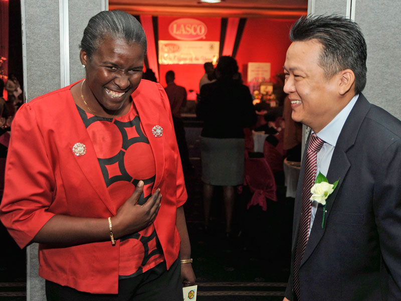 DSP Nadine Grant-Brown (left), LASCO's first female top coop, enjoys a light moment with Peter Chin, group logistics manager at LASCO Distributors, dring the Police Officer of the Year 2013-2014 awards ceremony on Tuesday.
