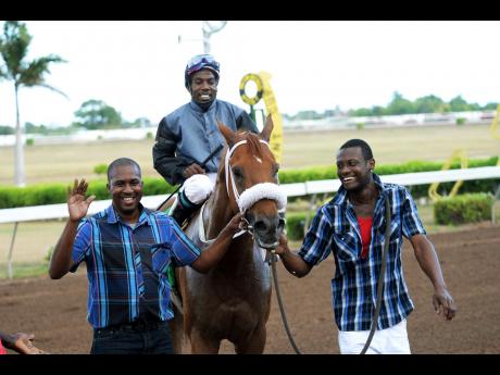 Ronald Williams (left) and Itamar King leading in SHINING LIGHT with jockey Paul Francis in the saddle following his win in the Easter Sprint Cup at Caymanas Park on Easter Monday.